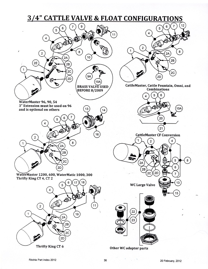 The Ritchie livestock valves and floats are very well constructed, trouble free, and reasonably priced. So much so that many of Ritchie’s competitors use the Ritchie valves in their waterers. The first page shows the 1/2″ configuration and component part numbers. The next two pages shows the 3/4″ configuration and part numbers. See more on this website regarding Ritchie Livestock Waterers here. Or jump over to our dedicated Ritchie website at www.RitchieInTexas.com